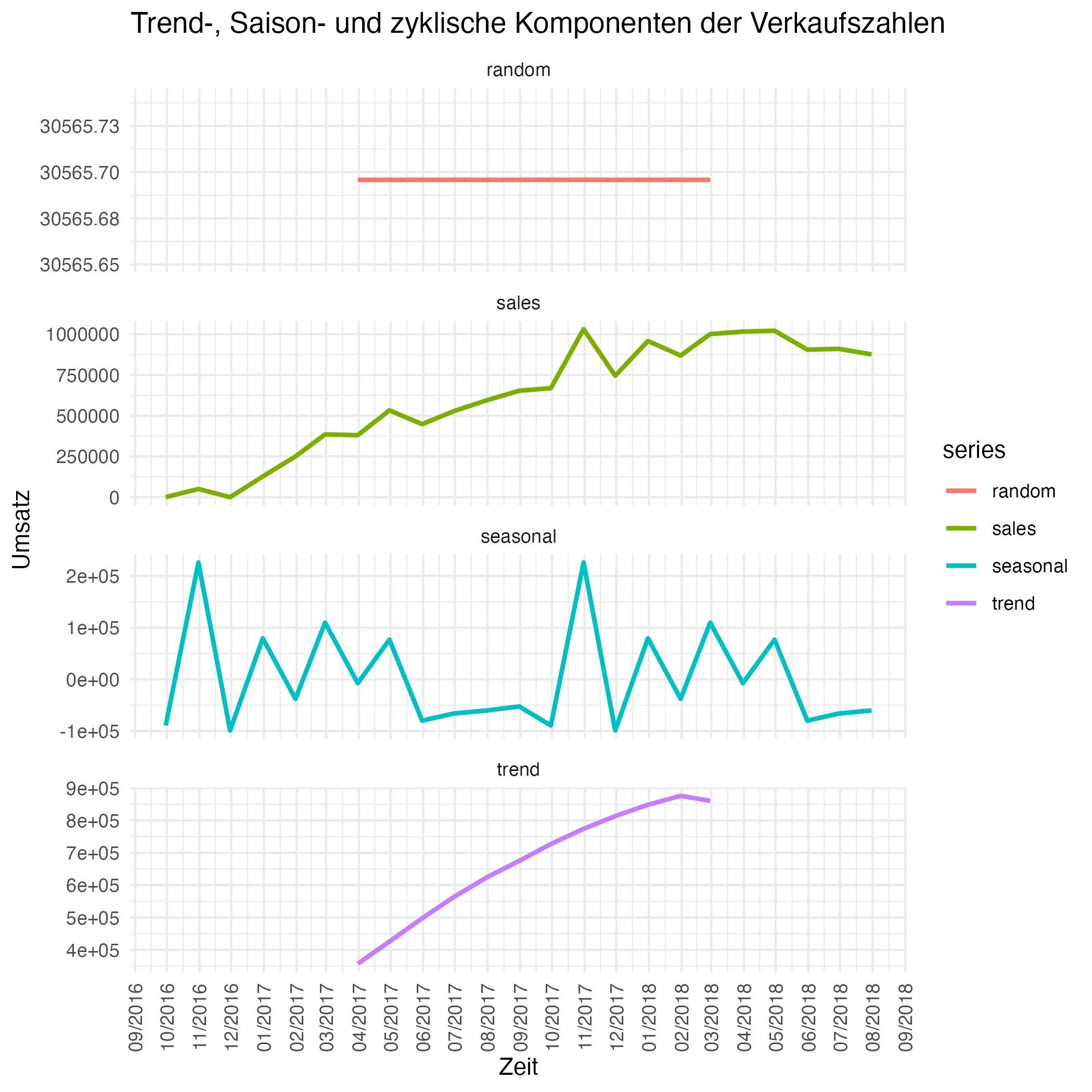 Die zufällige Komponente ist für die meisten Monate konstant, somit sind keine unerklärten Schwankungen in den Verkaufszahlen vorhanden, die nicht durch den Trend oder die saisonale Komponente erklärt werden können.